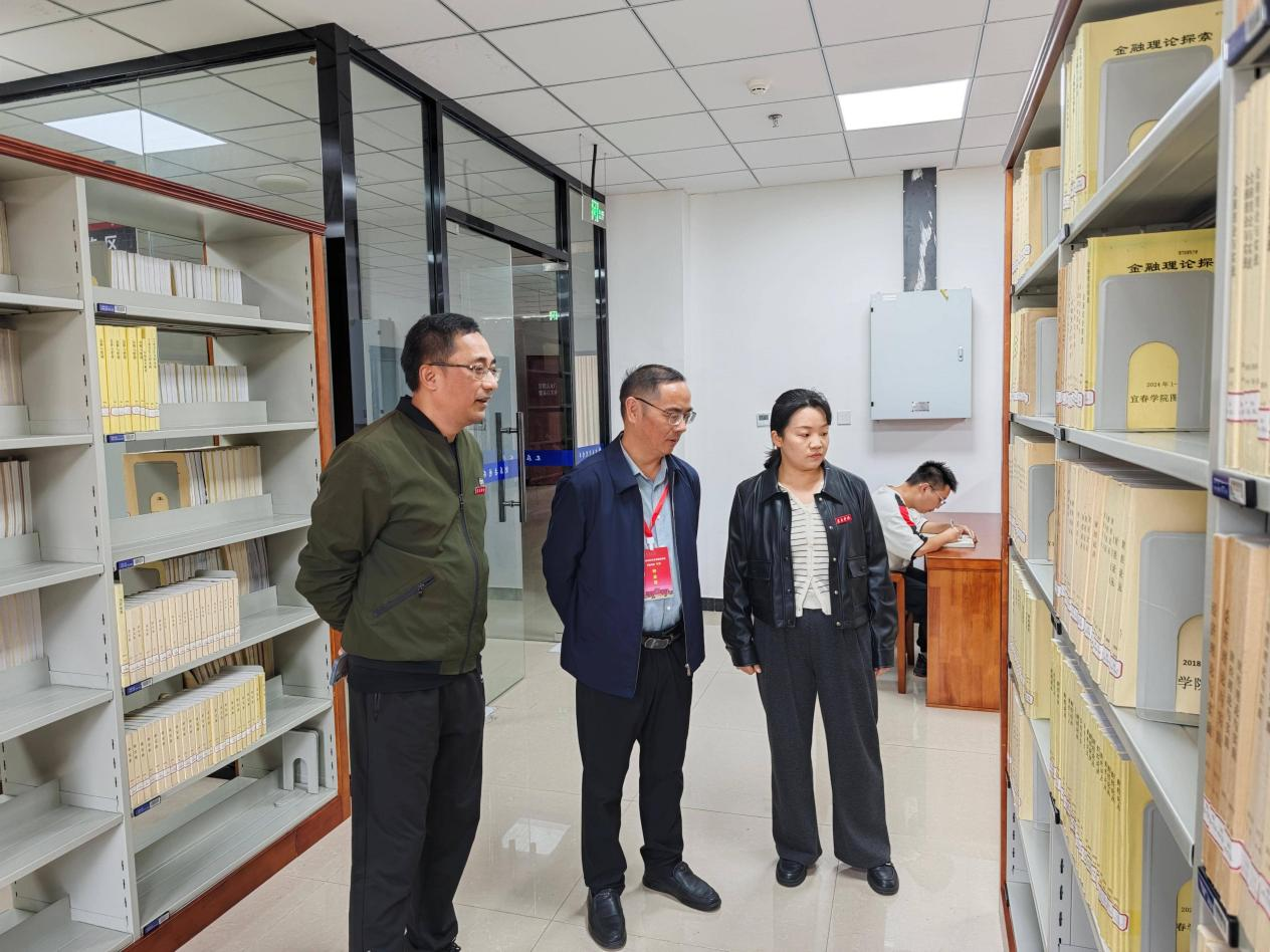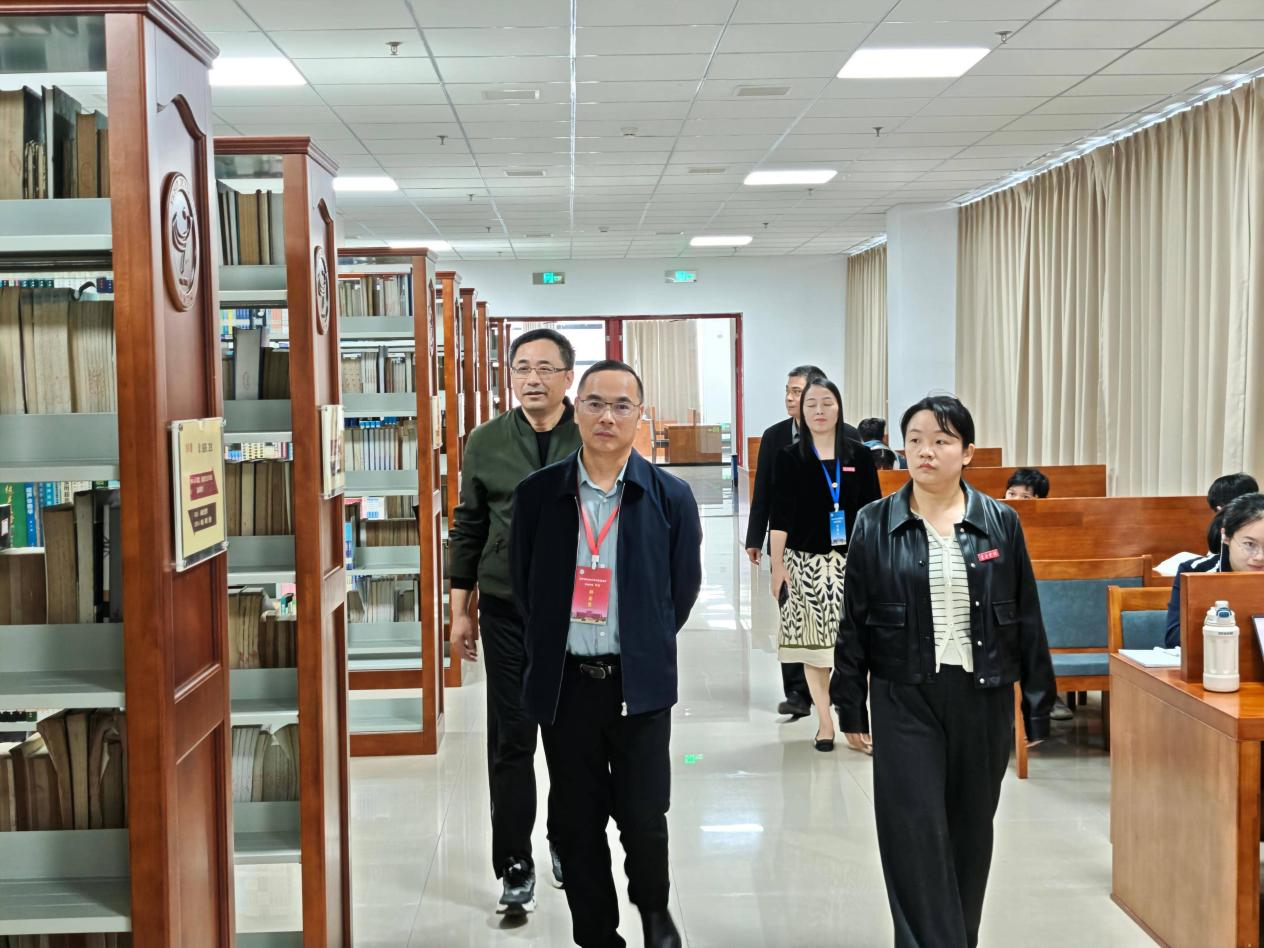 钟业喜教授认真听取汇报,并就馆藏资源利用率、学科服务针对性和学生阅读需求满足等问题,与陪同人员展开深入交流。他实地查看了书库、廉政阅览室和学生阅览室等区域,详细了解资源采购机制、服务流程优化和空间布局调整等具体工作,并对图书馆在支撑本科教育教学中的重要作用给予肯定。